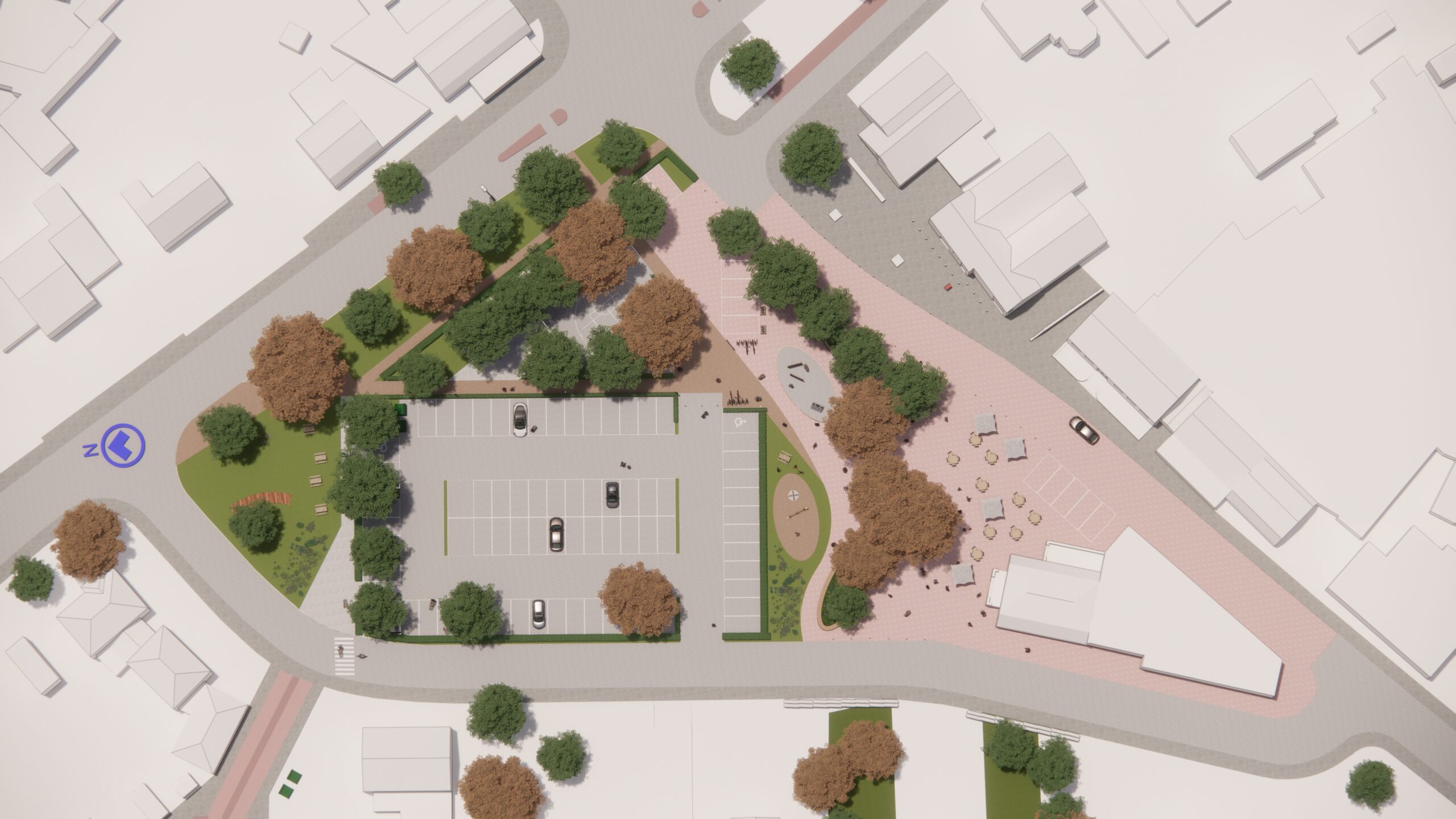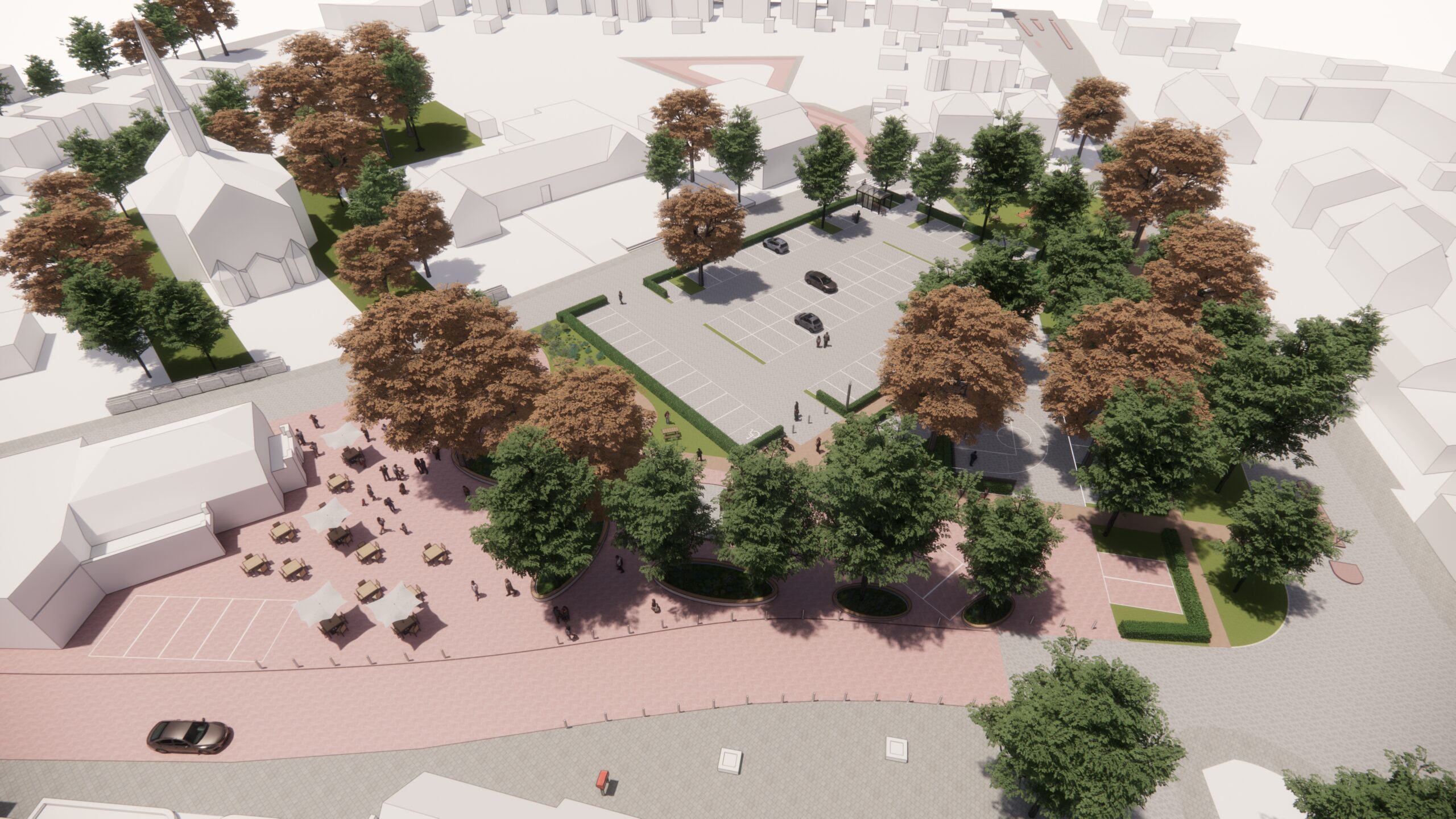 James - dit keer in samenwerking met Gordon Jack - heeft voor het Dorpsoverleg Heusden en de gemeente Asten het voorlopig ontwerp gemaakt voor het toekomstige dorpsplein. Het huidige plein bestaat uit een grote kale lap betonklinker bestrating en oogt erg gedateerd. Tijd voor een frisse look en meer levendigheid dacht het Dorpsoverleg, een lokaal burger initiatief van omwonenden en ondernemers. Een leuke opdrachtgever om te hebben, want je maakt samen echt iets voor een lokale en betrokken gemeenschap. Het idee achter het ontwerp is dat een deel van de bestaande autostraten komen te vervallen en/of autoluw worden gemaakt. Het bestaande onduidelijke parkeervlak wordt verkleind en veel efficiƫnter ingedeeld. De ruimte die daardoor ontstaat wordt gebruikt om een boulevard van rode stenen aan te leggen die de Voorste Heusden "verbind" met de horeca en de kerk aan de andere zijde van het plein. Op deze boulevard kan worden gerecreƫerd, de horeca kan zijn terrassen uitstallen onder de bomen, kinderen kunnen er veilig spelen en er kunnen elektrische fietsen worden opgeladen. De noodzakelijke parkeerplaatsen vallen weg achter een haag waardoor de auto's veel minder dominant in beeld zijn op het plein. Daardoor krijgt het nieuwe plein veel meer de uitstraling van een levendig en groen dorpshart met voor iedereen een plekje.